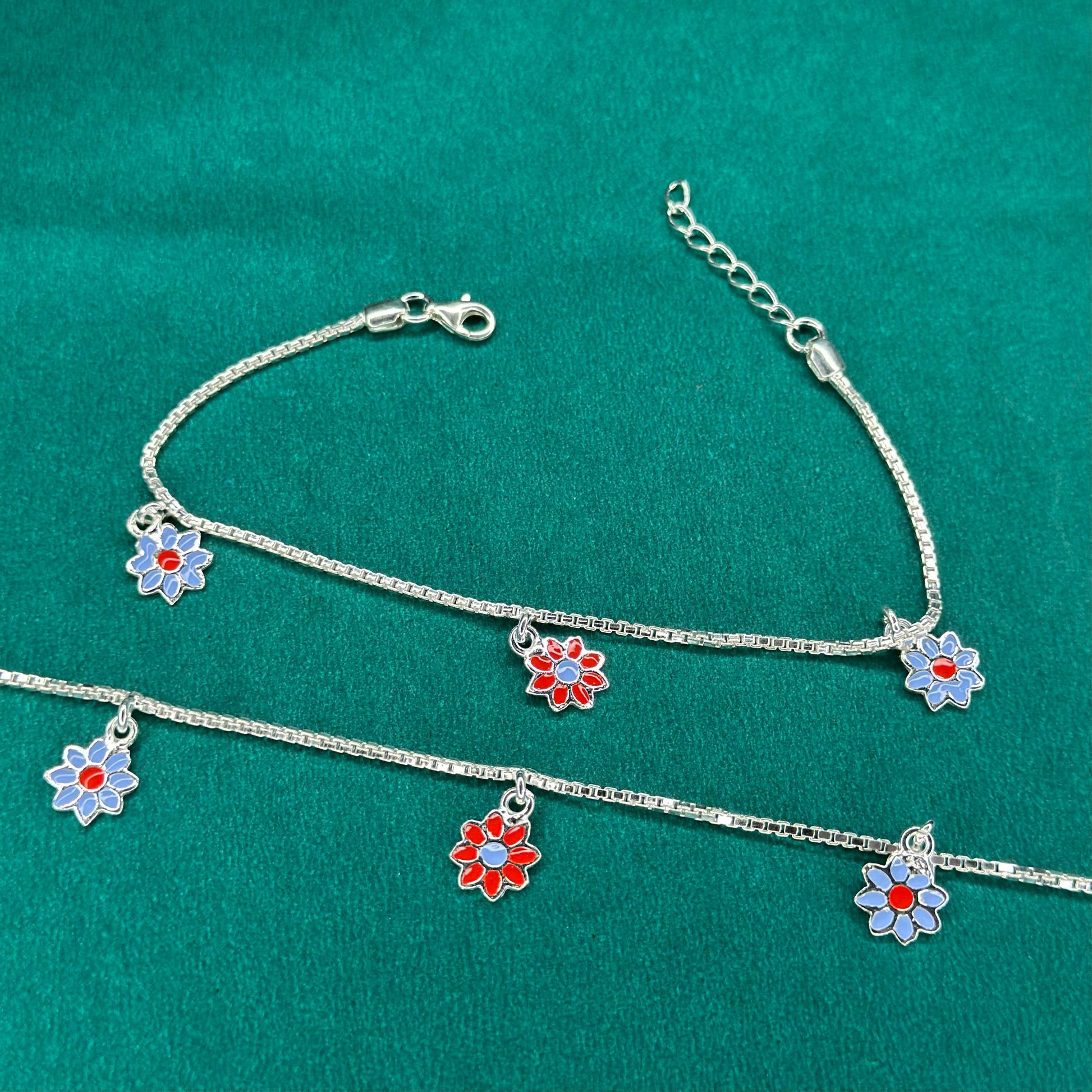 Delight your little one with this beautifully crafted 925 silver floral anklet, featuring colorful enamel flower charms in bright red and blue hues. Its playful yet elegant design adds a joyful sparkle to every step. Made with pure sterling silver, it ensures comfort, durability, and a skin-friendly finish — perfect for daily wear or gifting.
