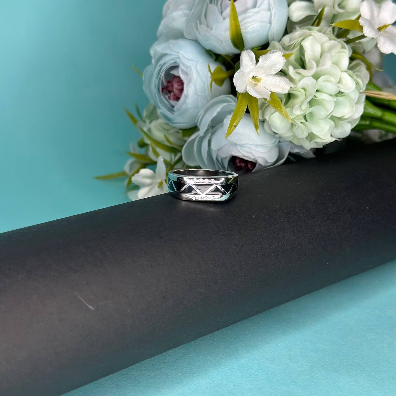 Elevate your style with the Geometric Pattern Band Ring, crafted from premium 925 sterling silver. The bold black enamel inlay features striking triangular motifs, enhanced with delicate silver dot detailing for a modern yet timeless look.
