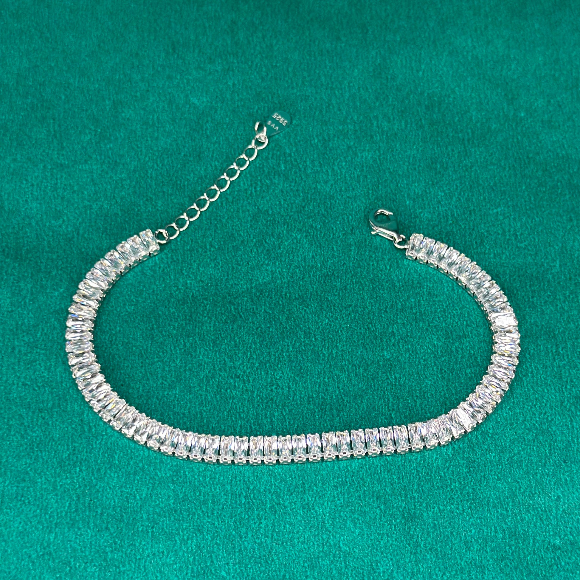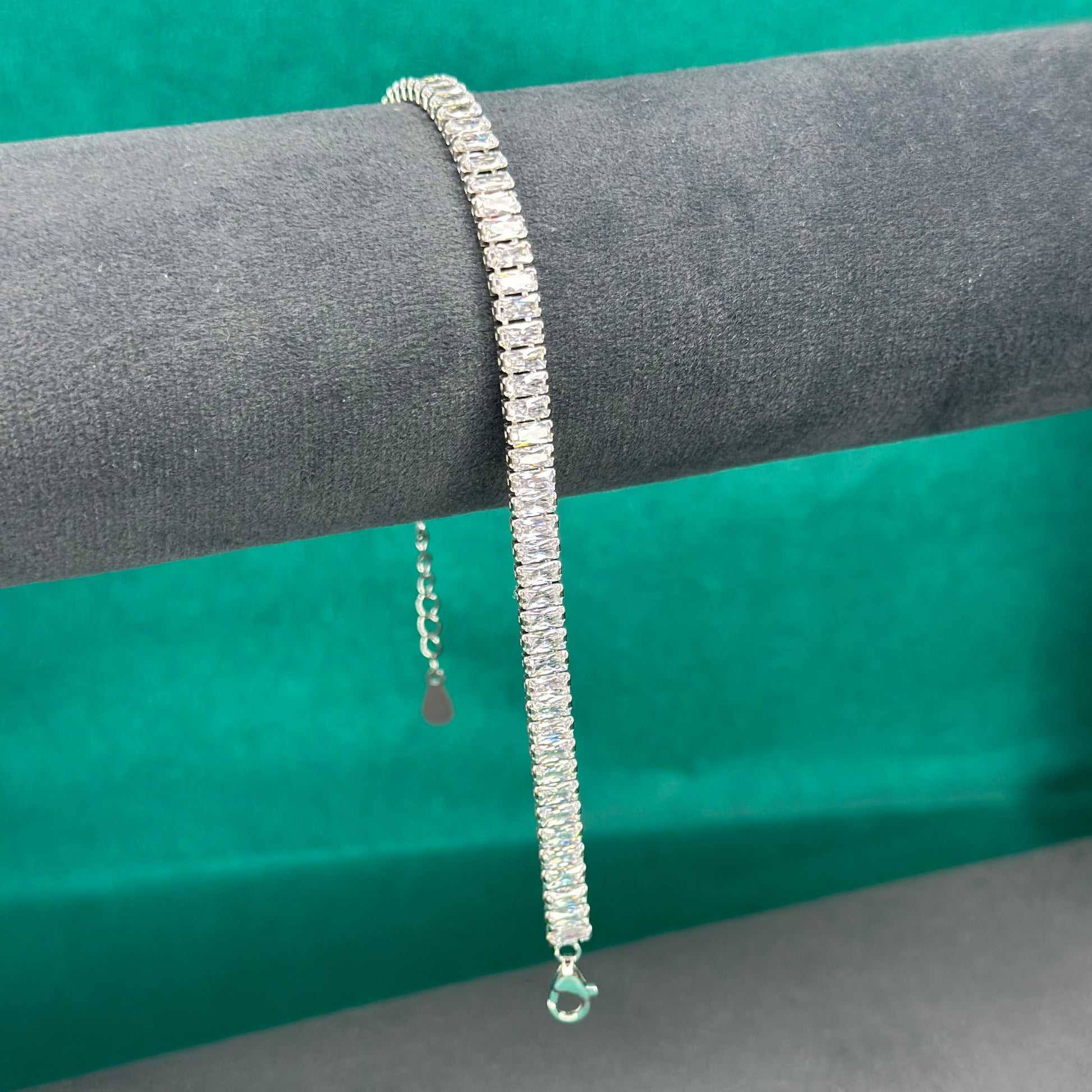 Is bracelet mein high-grade baguette-cut CZ stones lage hain jo har angle se dazzling shine dete hain. Pure 925 silver ki finishing isko classy, elegant aur long-lasting banati hai. Lightweight design ke wajah se yeh daily wear aur party look â dono ke liye perfect choice hai