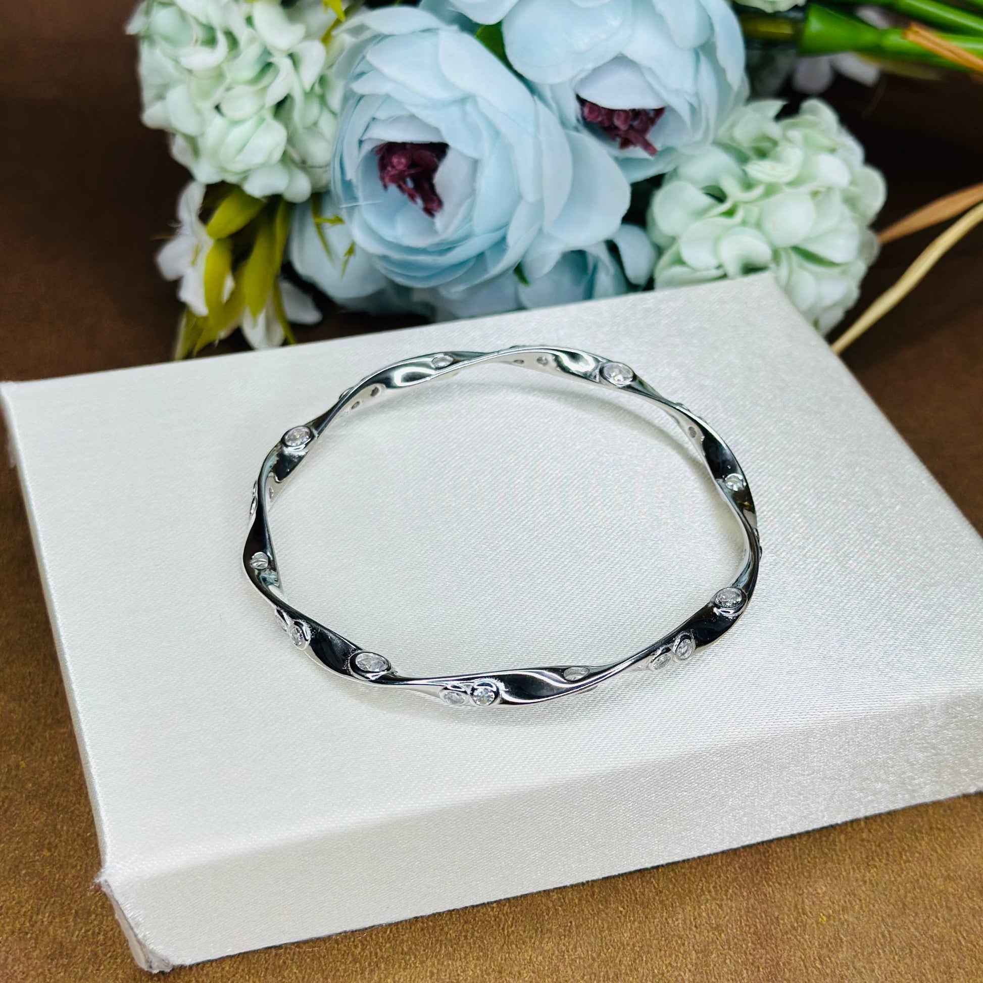 Elevate your jewellery collection with this 925 Sterling Silver Twisted Elegance Bangle. Designed with a graceful wave-like twist, this sleek bangle is adorned with sparkling cubic zirconia stones set seamlessly along the curve, creating a refined balance of shine and sophistication. Its versatile design makes it perfect for both casual outings and special occasions, adding a subtle yet striking charm to your look.