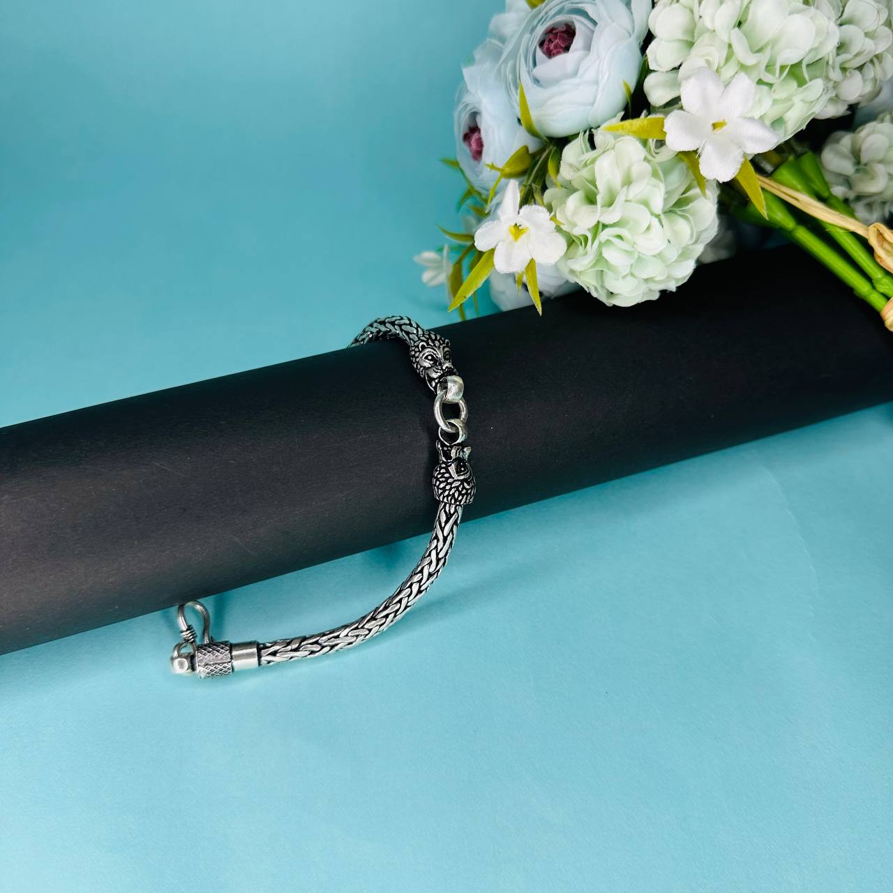 Unleash your inner strength with this striking 925 sterling silver bracelet, showcasing two intricately detailed dragon heads connected by a bold central link. The handwoven chain design adds texture and durability, while the antique oxidized finish enhances its rugged, masculine appeal. Dragons, long revered as symbols of power, wisdom, and protection, make this piece not only a fashion statement but also a talisman of resilience. Perfect for those who carry strength in their style.