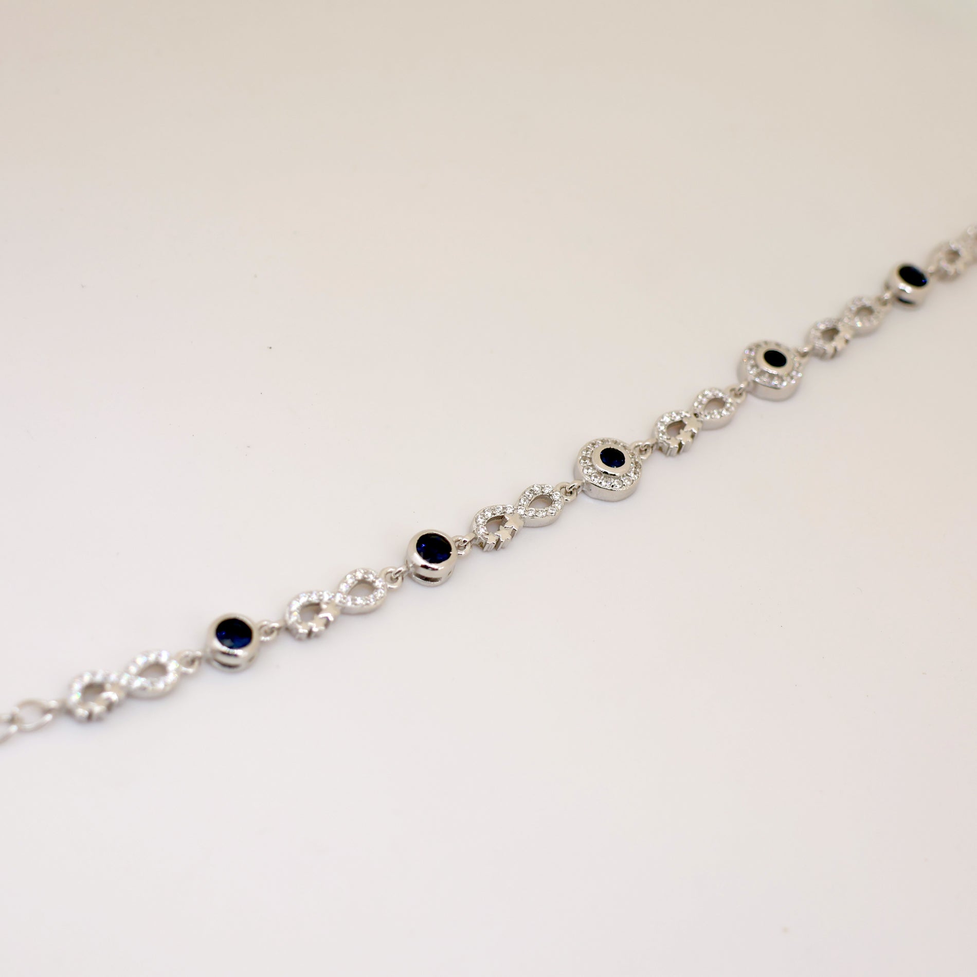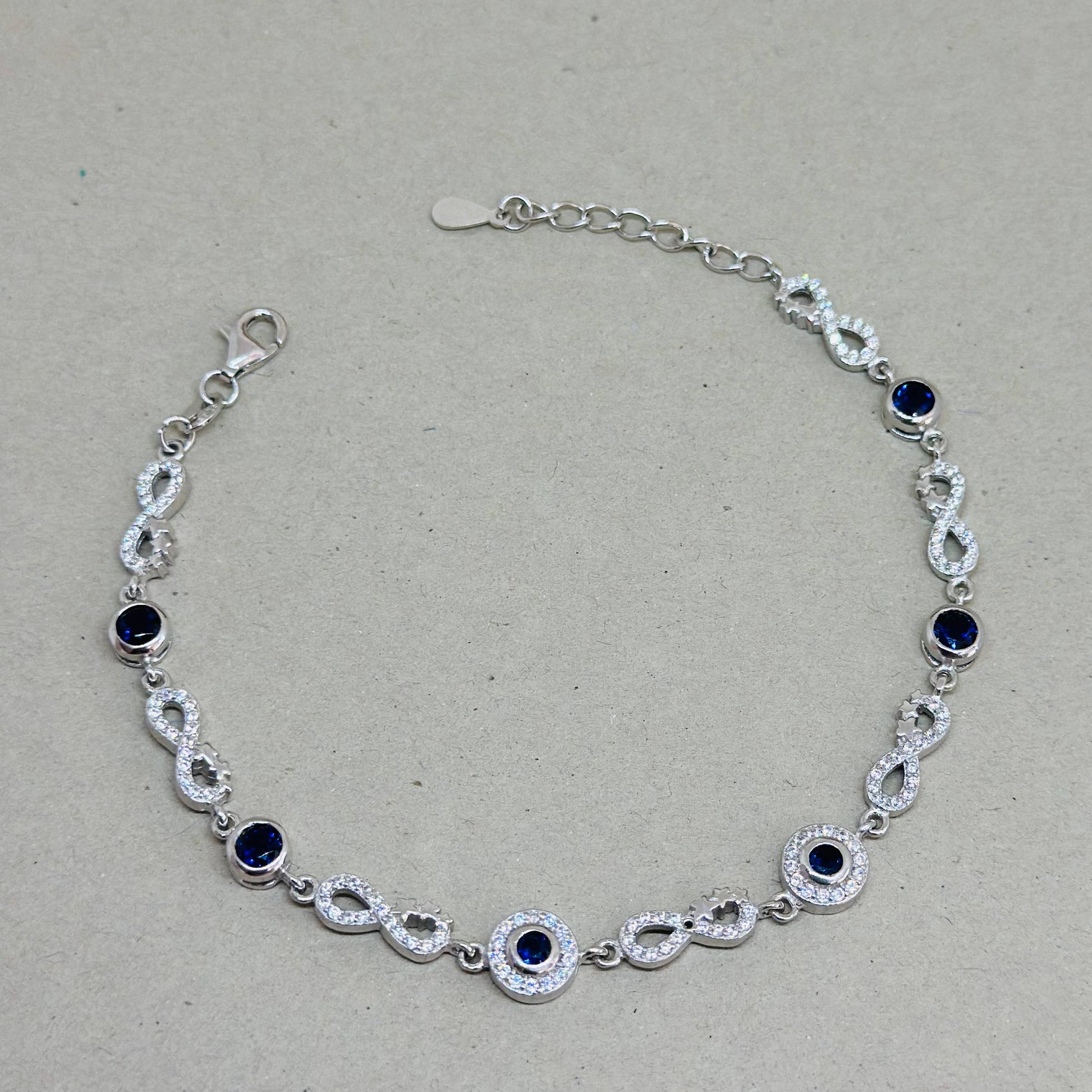 A sophisticated 925 sterling silver bracelet featuring alternating infinity links and round blue CZ stones encircled with sparkling accents. A timeless piece that symbolizes love, elegance, and protection, perfect for any occasion.