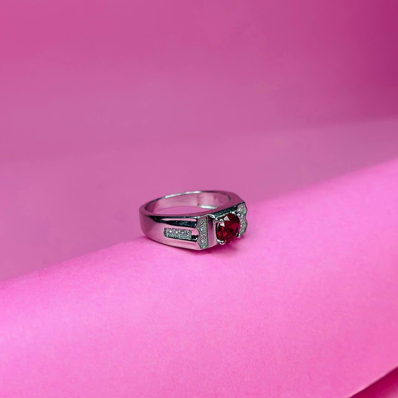 Make a bold impression with this striking 925 sterling silver men’s ring, featuring a brilliant round-cut red gemstone at its center. Flanked by intricate detailing and shimmering accent stones on either side, this ring exudes strength, confidence, and refined style.