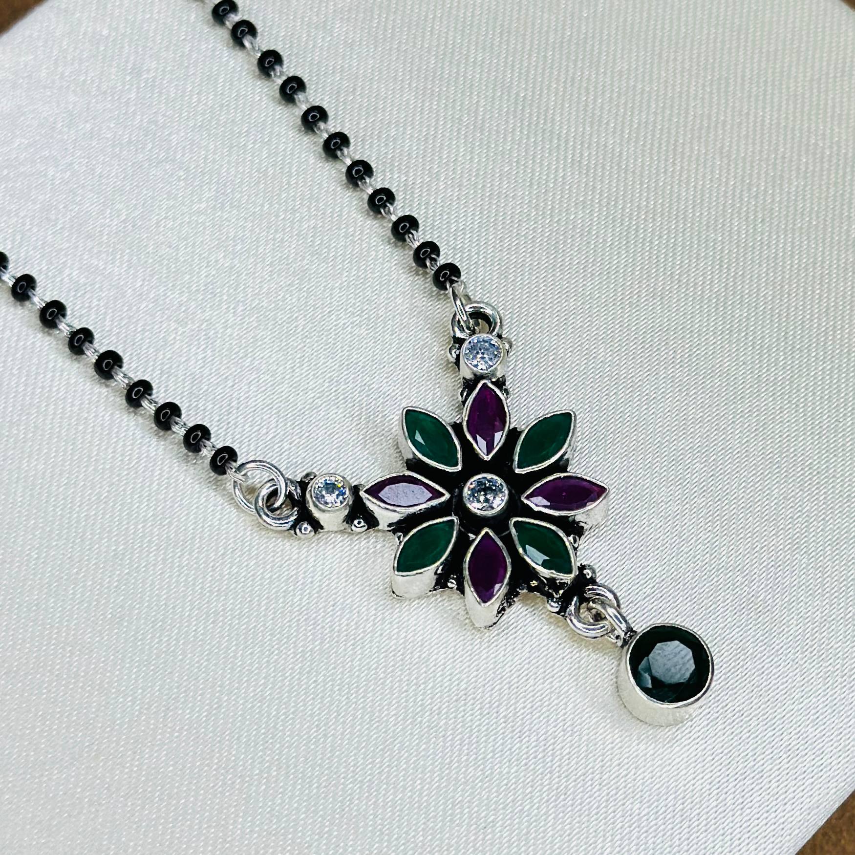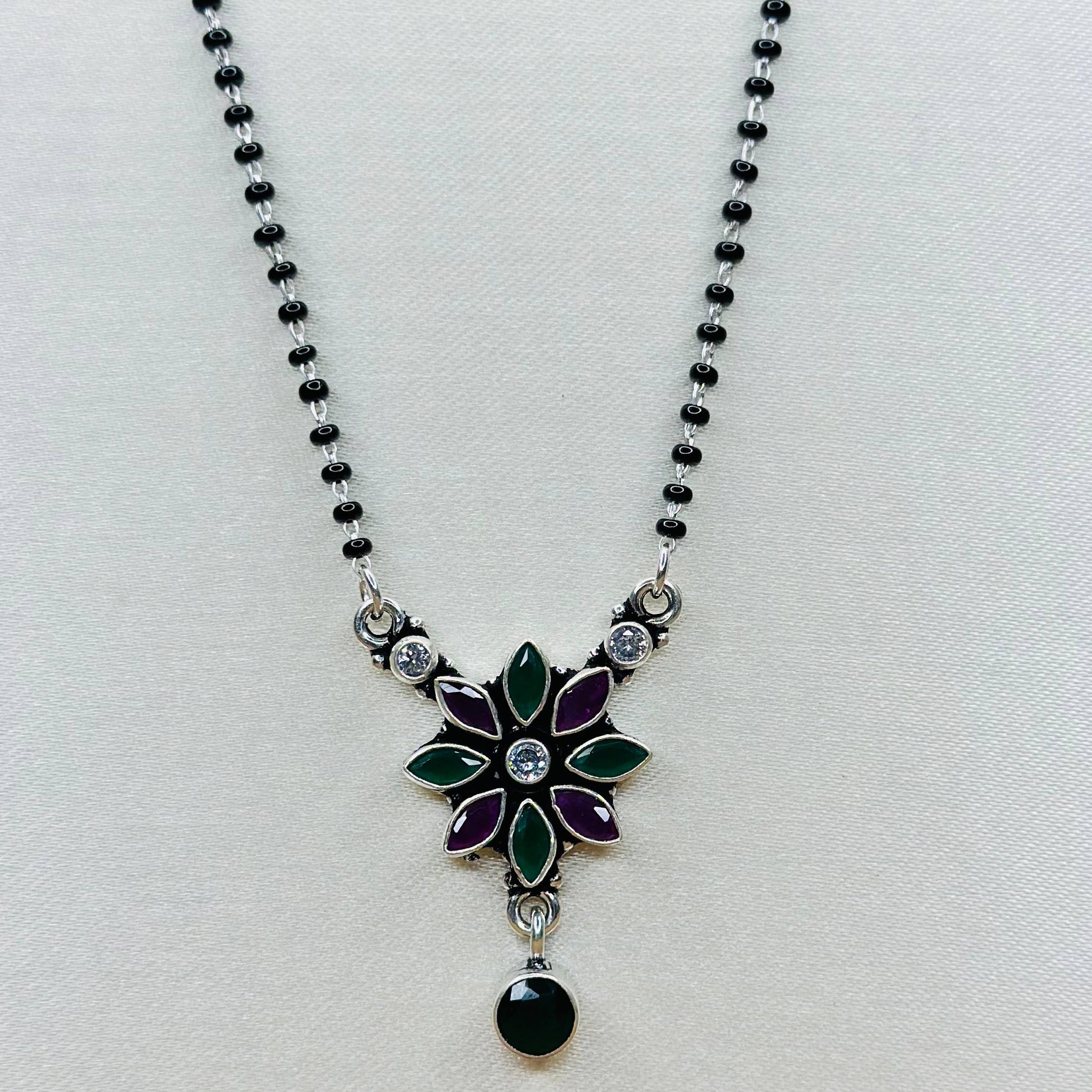 exquisite piece features a traditional black beaded chain with a vibrant floral pendant adorned with emerald green, ruby red, and sparkling white cubic zirconia stones. The star-shaped floral design symbolizes love, prosperity, and harmony, while the single drop stone adds a graceful finishing touch.