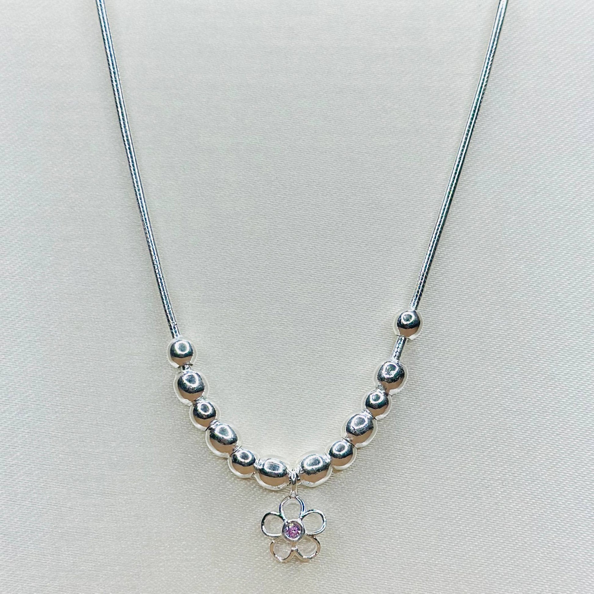 Delicate and elegant, the Blossom Bead Chain is beautifully crafted from 925 sterling silver. Featuring a sleek silver chain accented with a row of polished silver beads, the design is completed with a charming floral pendant adorned with a touch of pink cubic zirconia at its center. The flower symbolizes love, beauty, and new beginnings—making this necklace a meaningful and timeless accessory.