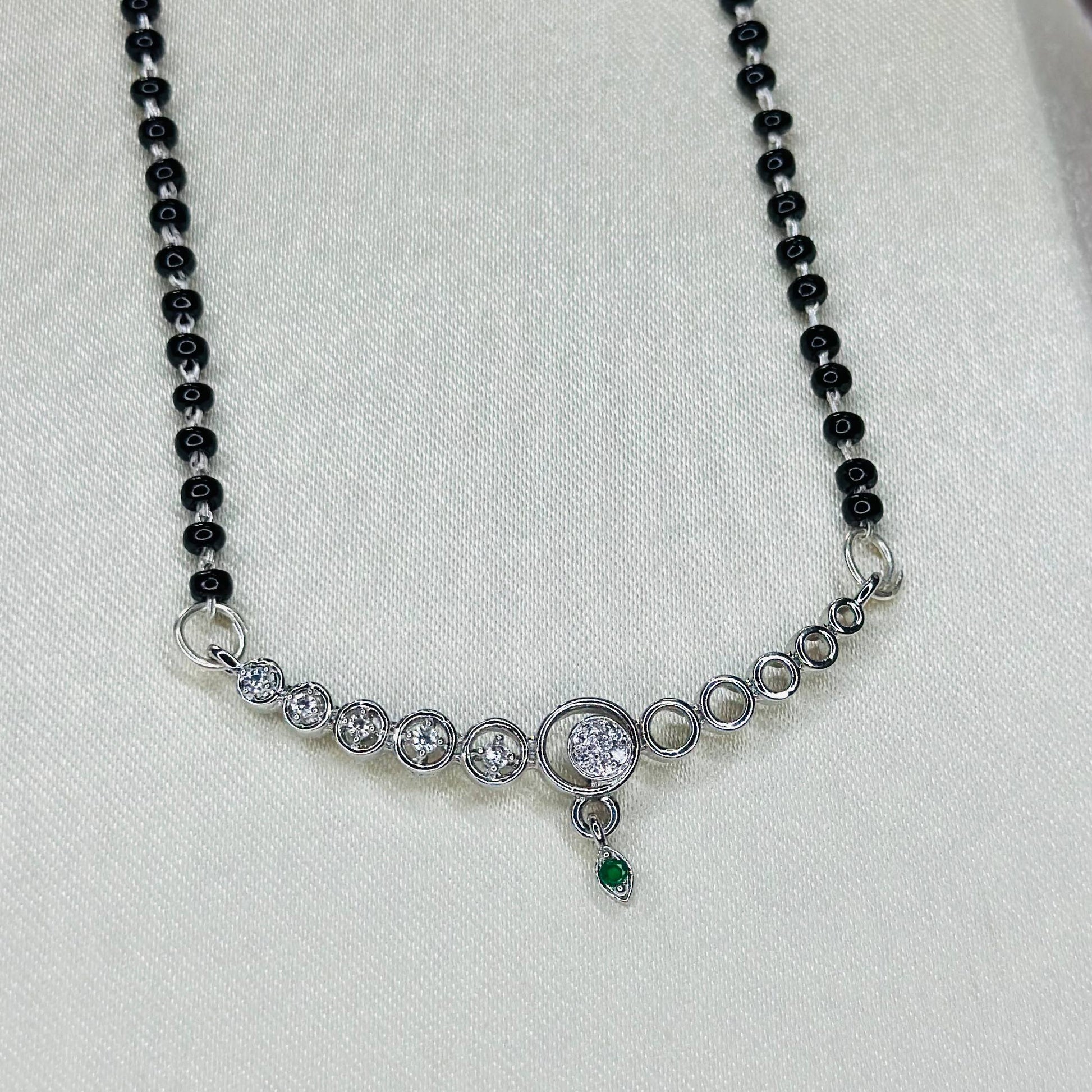 Inspired by the harmony of the universe, the Celestial Circles Mangalsutra is crafted in 925 sterling silver to symbolize eternal love and togetherness. The design features a traditional black beaded chain with a dazzling pendant of graduated circular motifs, highlighted with sparkling cubic zirconia and a touch of green stone for added grace and uniqueness.
