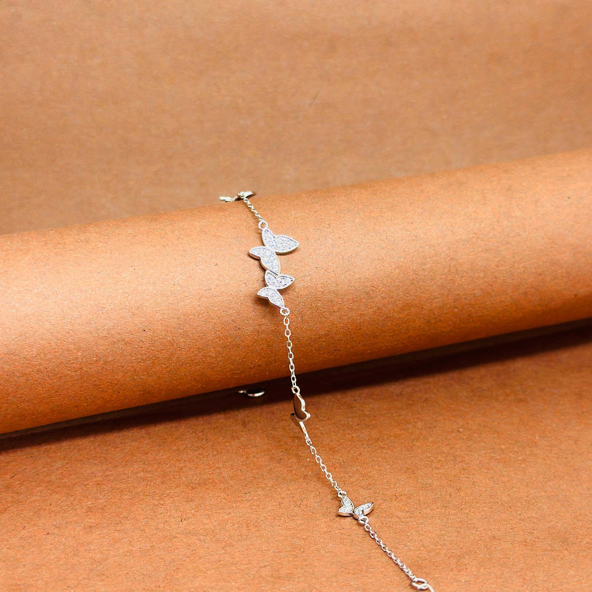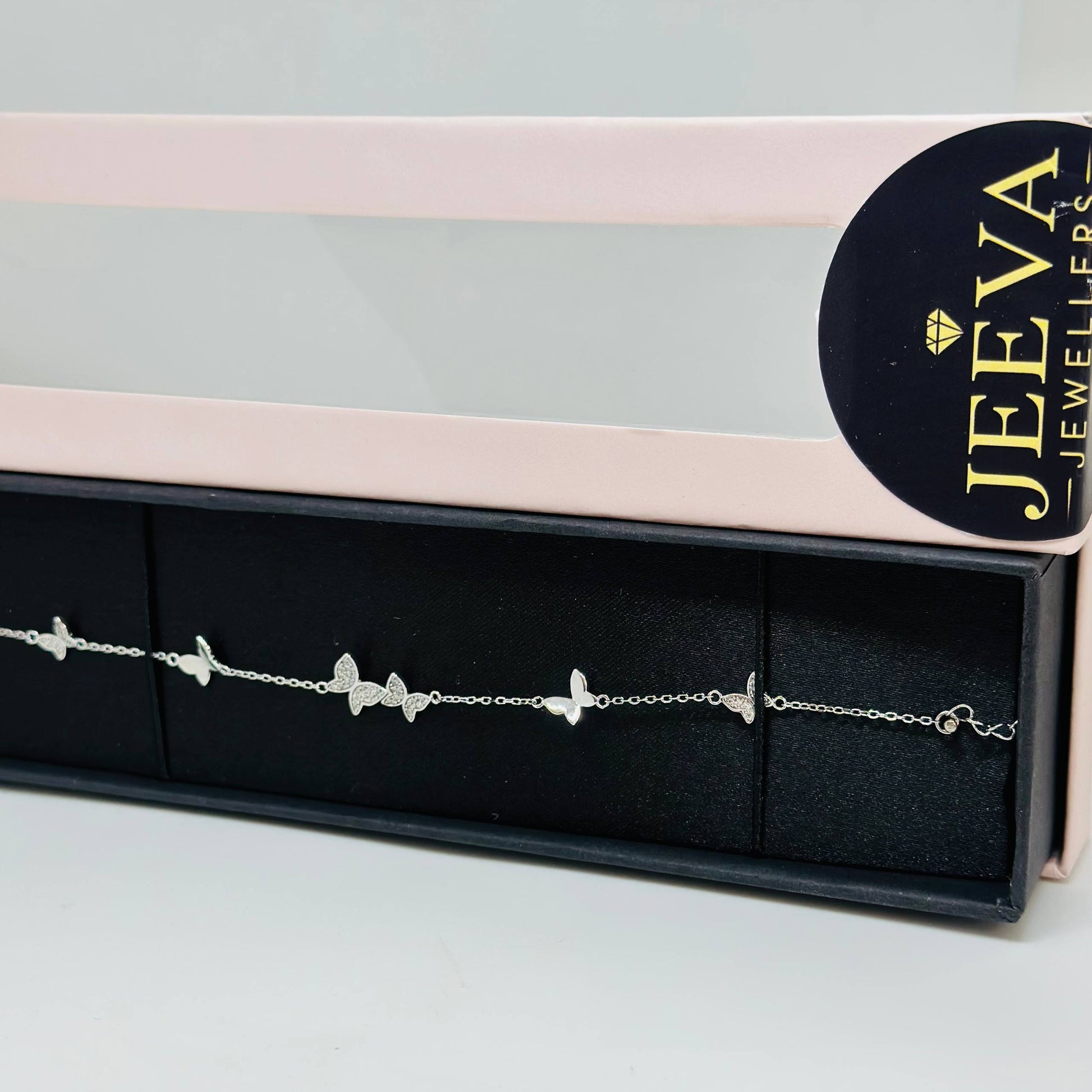 Let your style take flight with the Flutter Charm 925 Silver Bracelet. Designed with dainty butterfly motifs, this elegant piece adds a touch of sparkle and grace to your everyday elegance.