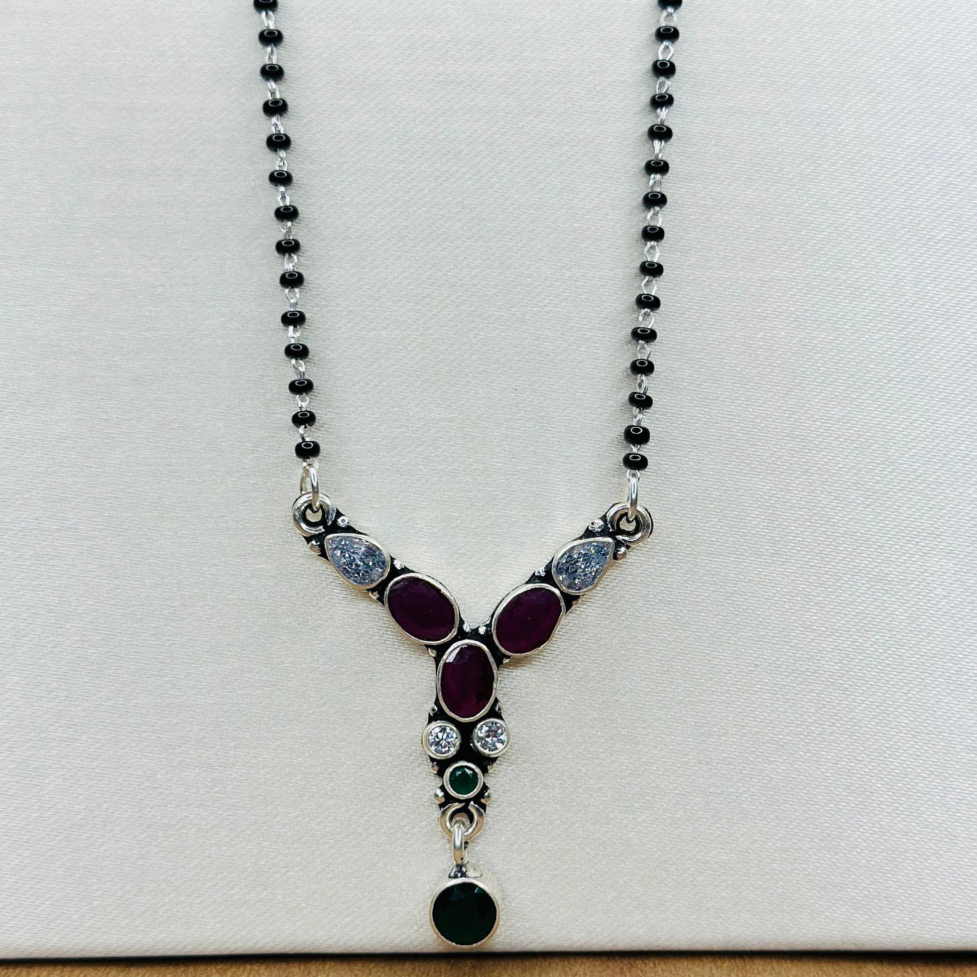 Embrace the beauty of tradition with our Radiant Grace Mangalsutra, crafted from premium 925 sterling silver. This stunning design features a black beaded chain paired with a dazzling pendant adorned with ruby red, emerald green, and sparkling white cubic zirconia stones. The elegant Y-shaped arrangement is finished with a striking drop stone, symbolizing love, harmony, and timeless devotion.