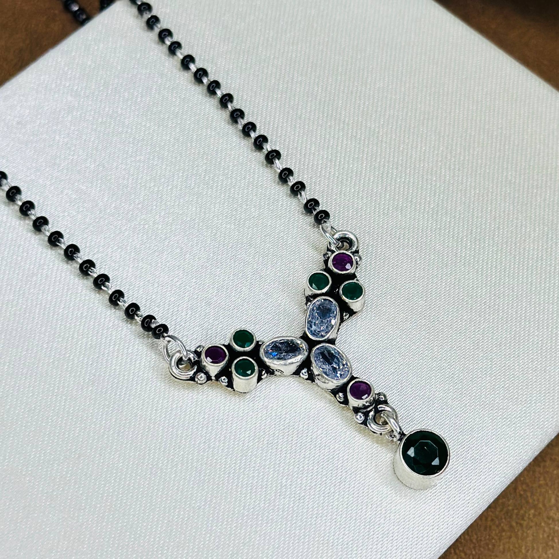 Celebrate the bond of love with our Trinity Charm Mangalsutra, finely crafted from 925 sterling silver. This elegant piece features a traditional black beaded chain paired with a vibrant pendant adorned with emerald green, ruby red, and sparkling white cubic zirconia stones. The unique Y-shaped design with a single drop stone at the base adds a graceful finishing touch, symbolizing harmony, devotion, and eternal togetherness.